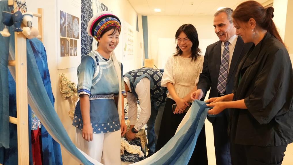 张翰敏带着扎染,一次次跨越山海,从英国、泰国到阿联酋、德国、芬兰,10余场国际艺术展览中,都有白族扎染静谧而有力的表达,让扎染作品被世界看见。